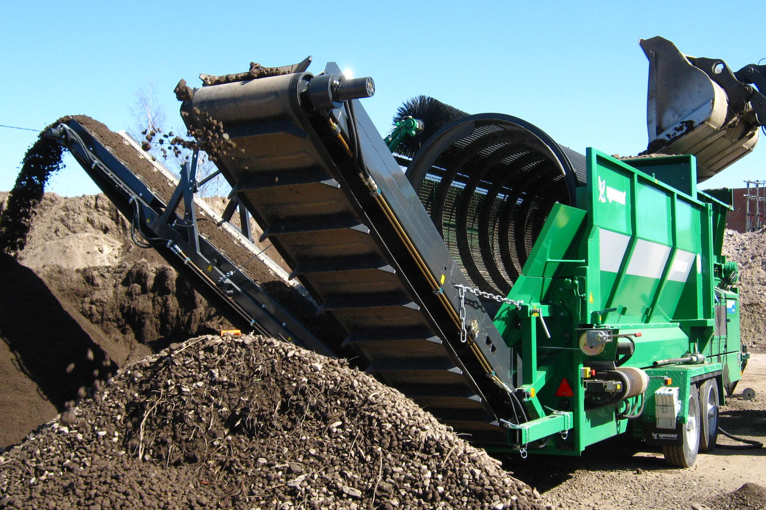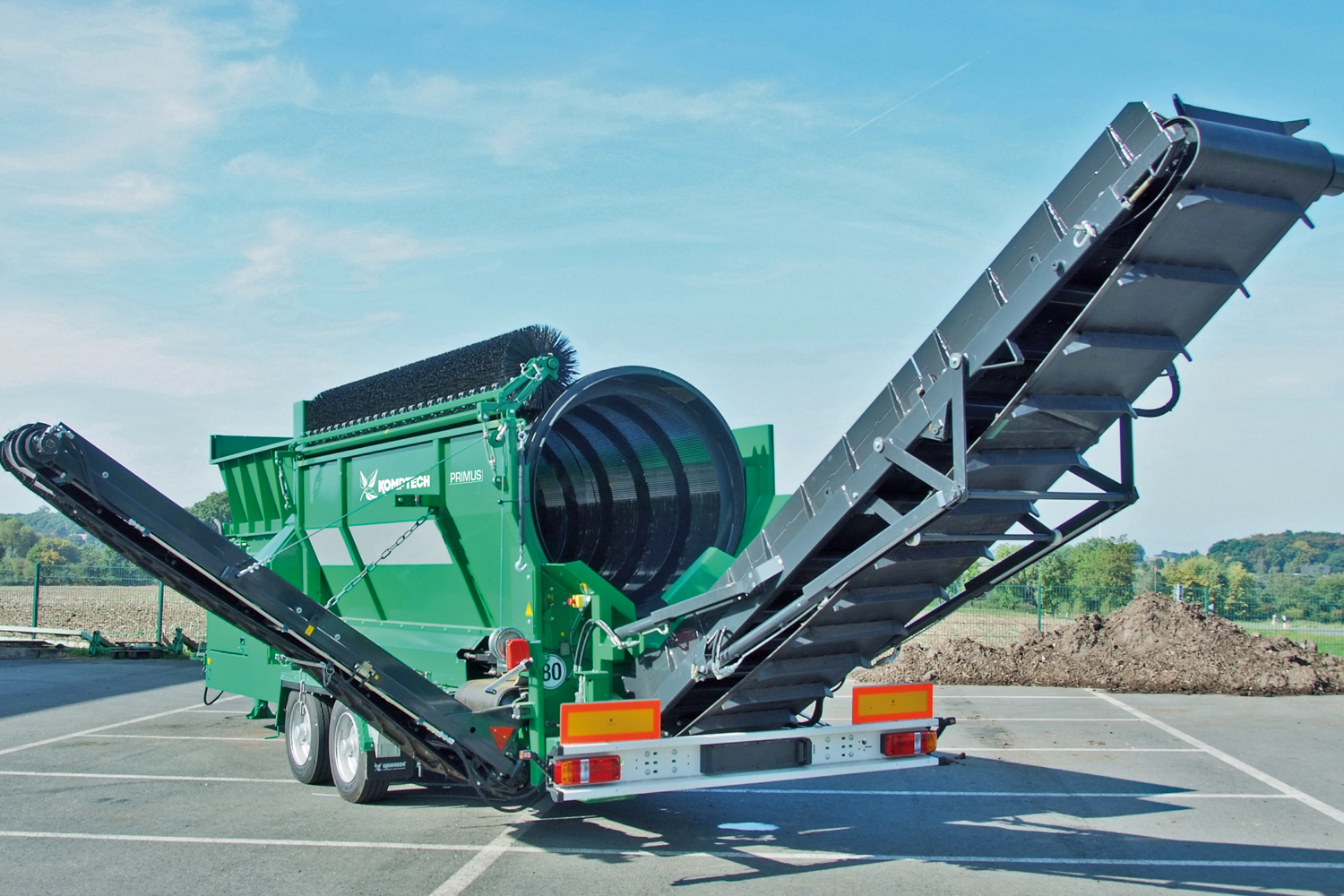 Il Primus è la scelta obbligata per chi vuole alte produzioni e dimensioni compatte. Progettato per un rimorchio a due assi centrali, il Primus ha un’area di vagliatura di 16 mq per gestire grandi lavori. Componenti per impieghi gravosi, nastro di scarico ribaltabile manualmente, trasmissione del tamburo idraulica tramite catena a rulli e un motore diesel ad alta efficienza garantiscono a questo modello un rapporto prestazioni/prezzo eccellente.